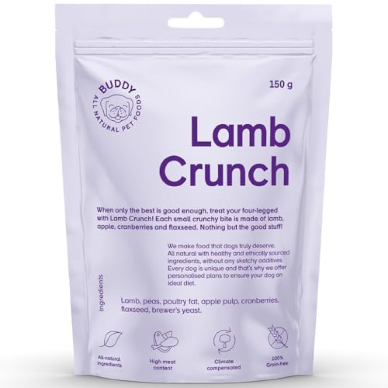 These Buddy Lamb Crunch treats, enriched with cranberries, offer your dog a tasty and wholesome snack. Made from organic ingredients and grass-fed lamb, they provide a nourishing boost that's rich in antioxidants, supporting your pet's overall wellbeing. The inclusion of cranberries adds a natural flavour and benefits the immune system, while the crunchy texture helps promote dental health during enjoyable chewing moments.