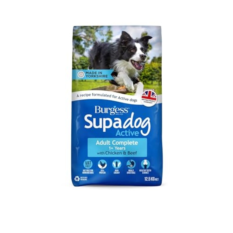 - Burgess Supadog Active with Chicken and Beef is a complete dry dog food for active working dogs.