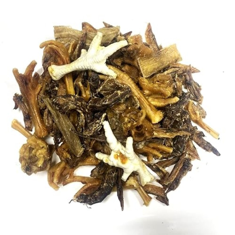 - Varied mix including chicken necks, feet, wings, and pigs' inner ears – offers different textures and flavours to keep dogs engaged
