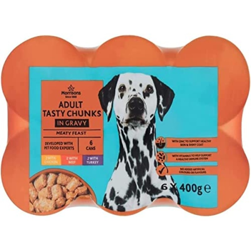 Treat your furry friend to Morrisons Adult Dog Food, Meaty Chunks in Gravy - a delicious meal developed with pet food experts to keep your dog happy and healthy.