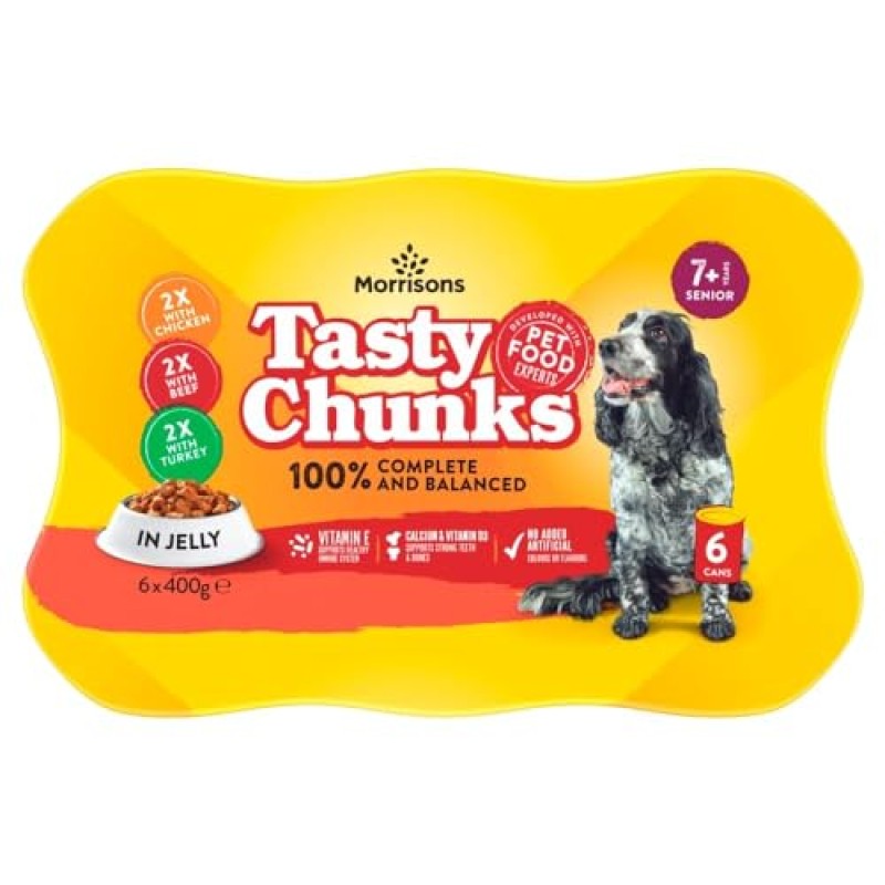 Treat your senior dog to a delicious meal with Morrisons Senior Dog Food, Meat Chunks in Jelly. This complete pet food is specially crafted for senior dogs, providing them with a tasty and nutritious feast.